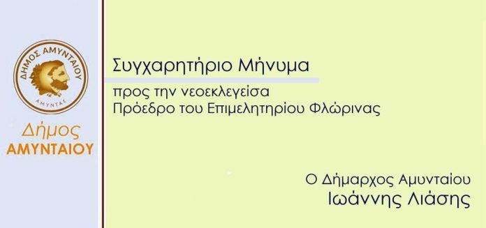 Συγχαρητήριο μήνυμα του Δημάρχου Αμυνταίου, Ιωάννη Λιάση, προς τη νεοεκλεγείσα Πρόεδρο του Επιμελητηρίου Φλώρινας Βαλίνα Ρόζα